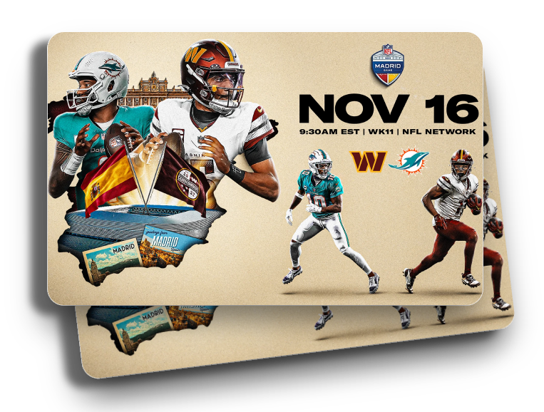 Bitte gib auf der nächsten Seite deine Gewinndaten ein und gewinne Tickets + 3.000€ Reisegeld für zwei Personen für das NFL Game Washington Commanders - Miami Dolphin am 16.11.2025 in Madrid!